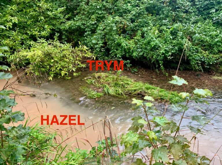 The point at which the Hazel Brook joins with the River Trym at Combe Dingle. Notice the colouration of the Hazel Brook – summer 2025. Credit: Trout in the Trym.
